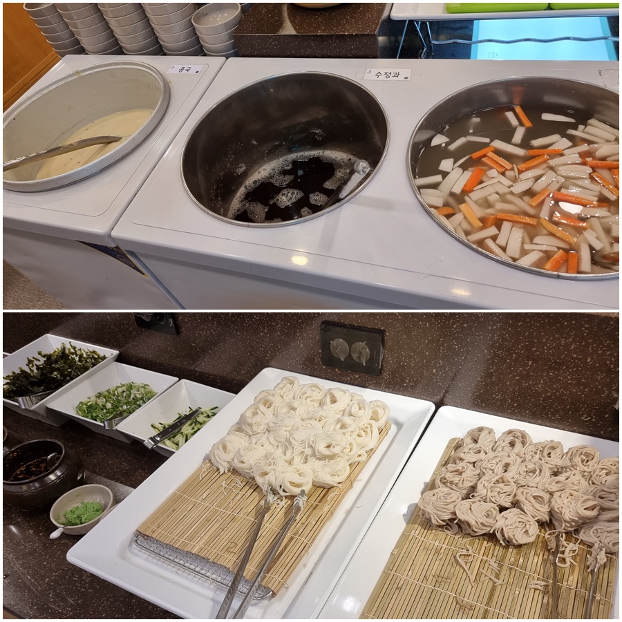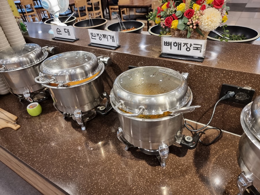 국종류는 된장찌개, 뼈해장국, 미역국등 3종정도 있고, 분식메뉴로 순대 있고 떡볶이가 늘 나오는 것 같습니다.